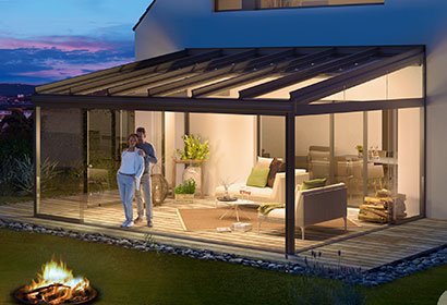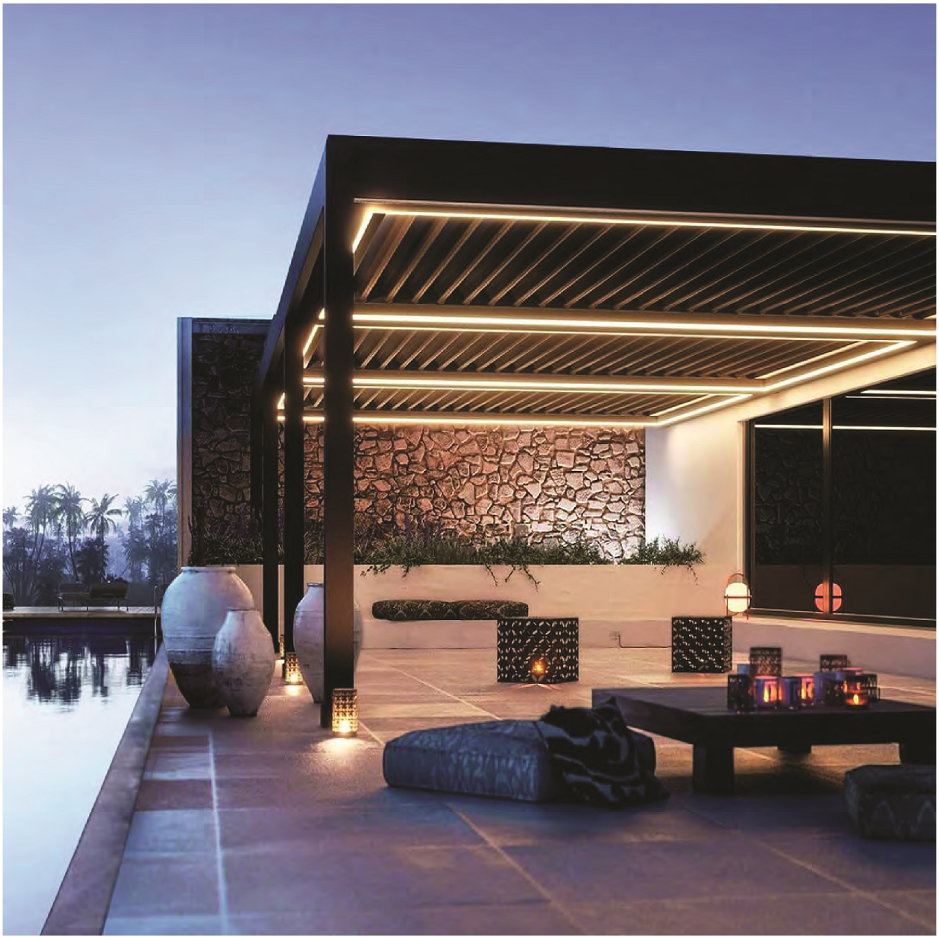 Our Pergola roof panels retract and rotate, they can be fitted with 5 different glass door designs.